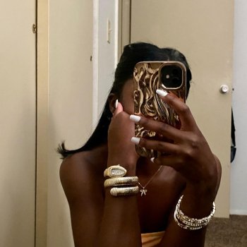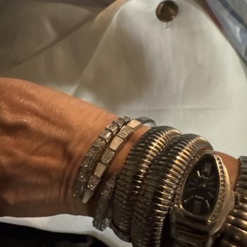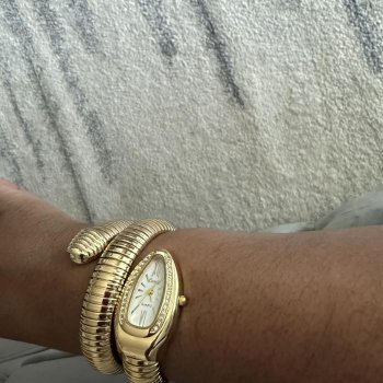 bought this for my wife... she was overjoyed to see such elegance wrapped around her wrist. the gold quartz sparkles brilliantly under light and the snake wrap design? simply spellbinding!
