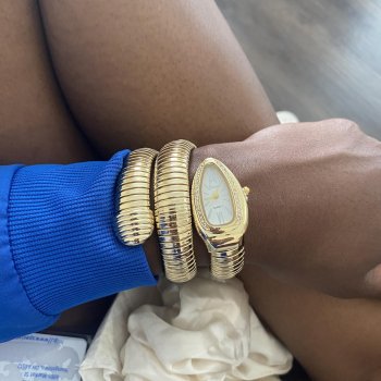 Never have I been so enamored by a timepiece before. The moment I laid my eyes on this watch, it was love at first sight! Its luxurious design is absolutely captivating, with the snake wrap adding an exotic touch that’s both unique and stylish. But what truly takes it over the top are the rhinestones – they glitter and sparkle with every movement of my wrist, catching everyone's attention. It's not just a watch; it's a statement piece that adds elegance to any outfit I wear. The gold quartz face is clear and easy to read while also being incredibly chic! This isn't just about telling time - it's about making every second count in style.